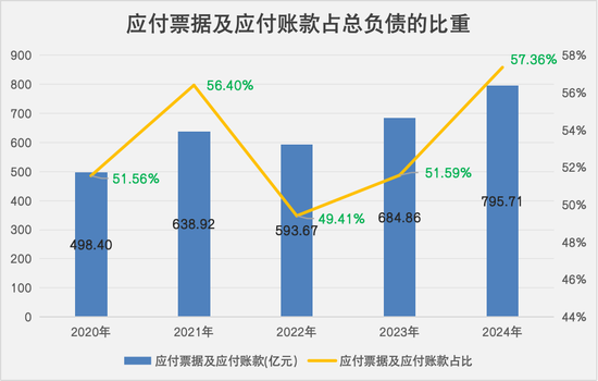 2022年~2024年,长城汽车应付票据及应付账款金额逐年上升,且在总负债中的占比一直处于高位,2024年占比达到57.36%,这意味着长城汽车非常依赖供应链融资来支持自身经营。