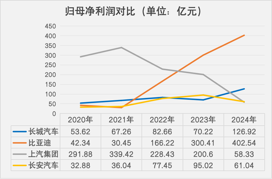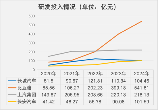 相比于比亚迪、上汽等车企,长城汽车研发投入并不高,2022年研发投入为121.81亿元,为近年来最高。2023年~2024年,长城汽车减少研发投入,2024年仅为104亿元。