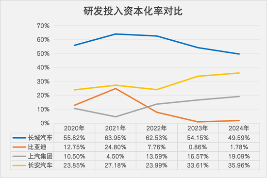 2018年,长城汽车开始进行研发投入资本化,并保持较高比例。2019年,研发投入资本化率为48.85%,为历年占比最低,最高为2021年,研发投入资本化率高达63.95%。2022年,长城汽车资本化研发投入规模高达76.17亿元,2023年~2024年,长城汽车研发投入总额和资本化比重下降,2024年资本化研发投入降至51.80亿元。