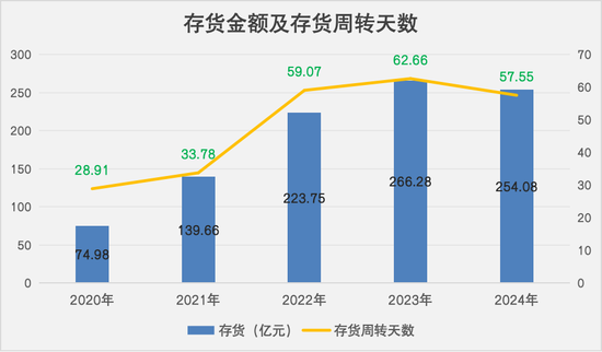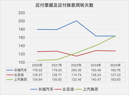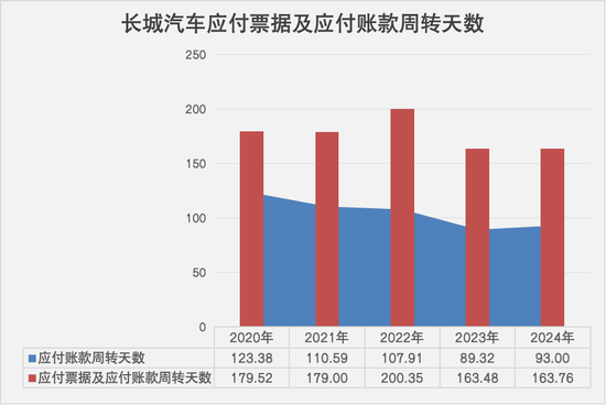 此外,2020年~2024年,长城汽车应付票据及应付账款周转天数,始终高于160天,2022年周转天数一度超过200天。2023年以来,长城汽车采取更稳健的财务策略,试图降低应付票据及应付账款周转天数,但2024年周转天数仍保持在约164天。