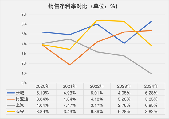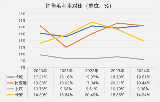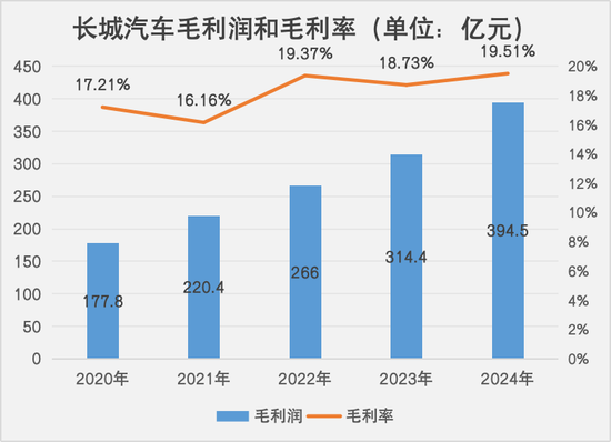 2024年,长城汽车销售费用率(销售费用/营业收入×100%)降至3.87%,管理费用率(管理费用/营业收入×100%)降至2.35%,合计节省费用约5.6亿元,直接转化为利润。营业成本同比增长14.79%,低于营业收入增速,毛利率同比提升1.36个百分点至19.51%,成本管控能力较强。