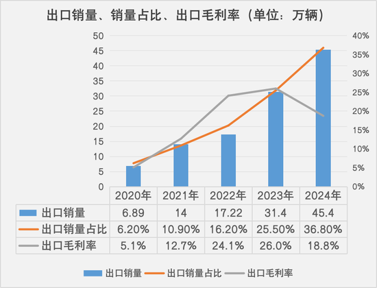 2021年开始,长城汽车出口量显著增加,2023年出口销量占比达到25.5%,毛利率达到26%,2024年出口量达到45.4万辆,占比接近四成。从单车售价来看,2024年,长城汽车国内、国外单车售价分别为15.3万元、17.7万元,海外单车售价也较高。