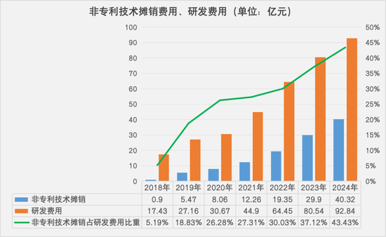 2019年开始,长城汽车资本化研发投入开始进行摊销,摊销比例逐年上升。2019年,非专利技术摊销费用为5.47亿元,占研发费用的比重仅为18.83%,到2024年,非专利技术摊销费用已经增长至40.32亿元,占比达到43.43%。
