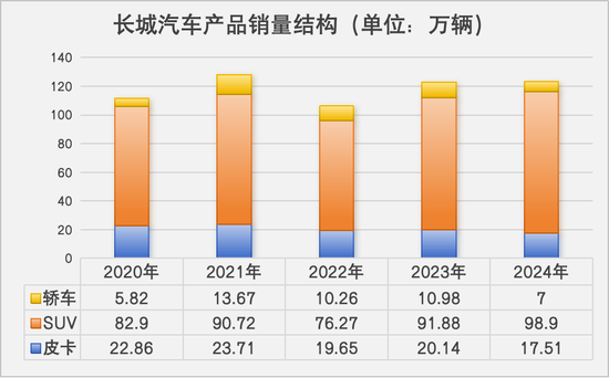 但需要注意的是,长城汽车目前仍重度依赖SUV,销量受SUV车型波动影响较大,皮卡近几年也呈现下滑趋势。2024年,SUV占总销量的比例高达80%,皮卡销量占比仅为14%。