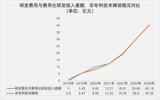 财报显示,长城汽车将资本化研发投入,几乎全部转化为“无形资产”项目中的“非专利技术”上,少部分转化为“软件及其他”中。这可从研发费用与费用化研发投入的差额与非专利技术摊销金额的曲线重合度中推测得出。