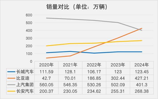 长城汽车销量已在100万辆徘徊9年时间。2016年,长城汽车销量实现107万辆,首次突破100万辆大关,2021年销量为历年最高,实现128万辆,2024年销量又回落至123.45万辆。今年一季度,长城汽车累计销量25.68万辆,同比下滑6.73%。